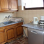 Keuken gasherd, eetafel met stoelen, vaatwasser, koelkast, vriezer