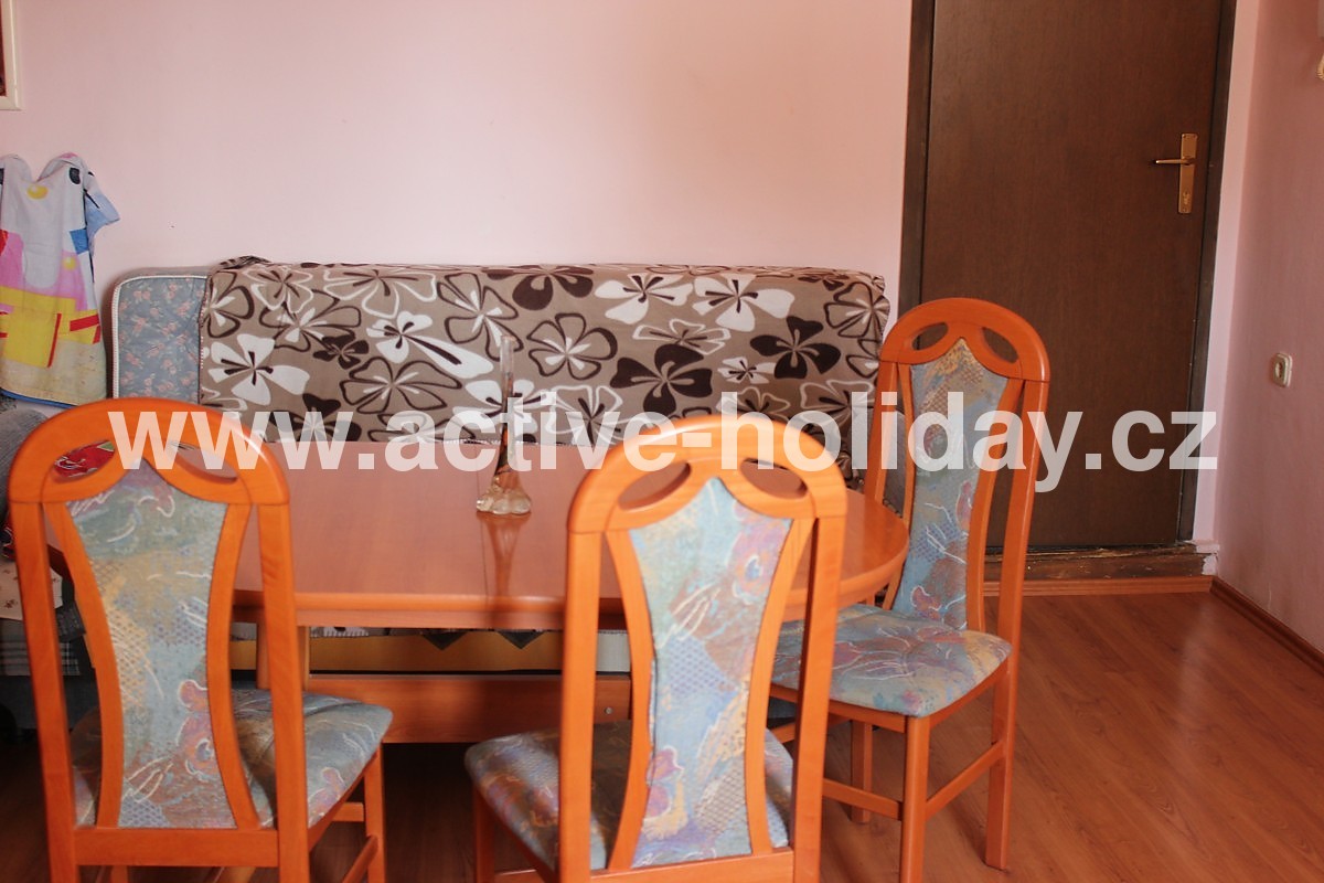 Woonkamer 1 x tweepersoonsbed, 1 x slaapbank, kastje, nacht lamp, nachtkastje, tv, satelliet, eetafel met stoelen